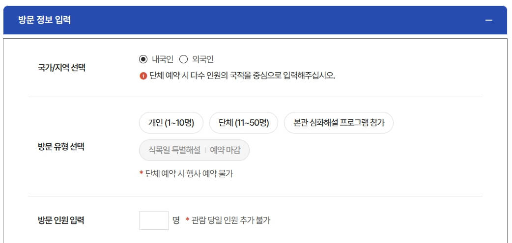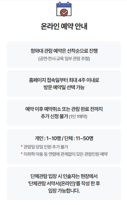 청와대는 하루 입장 인원이 제한되어 있어 100% 사전 예약제로 운영되고 있습니다. 현장 접수는 불가능하기 때문에 반드시 인터넷으로 미리 신청해야 합니다.